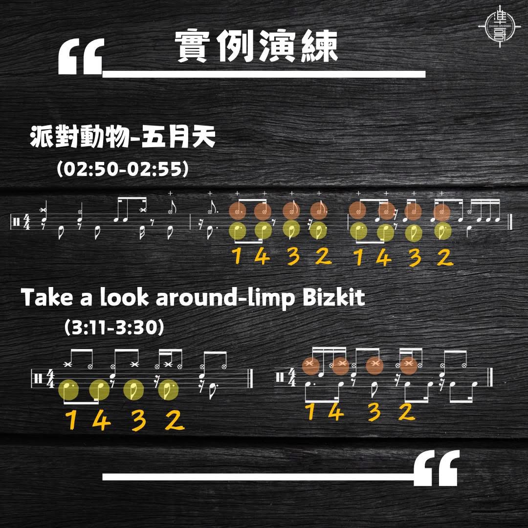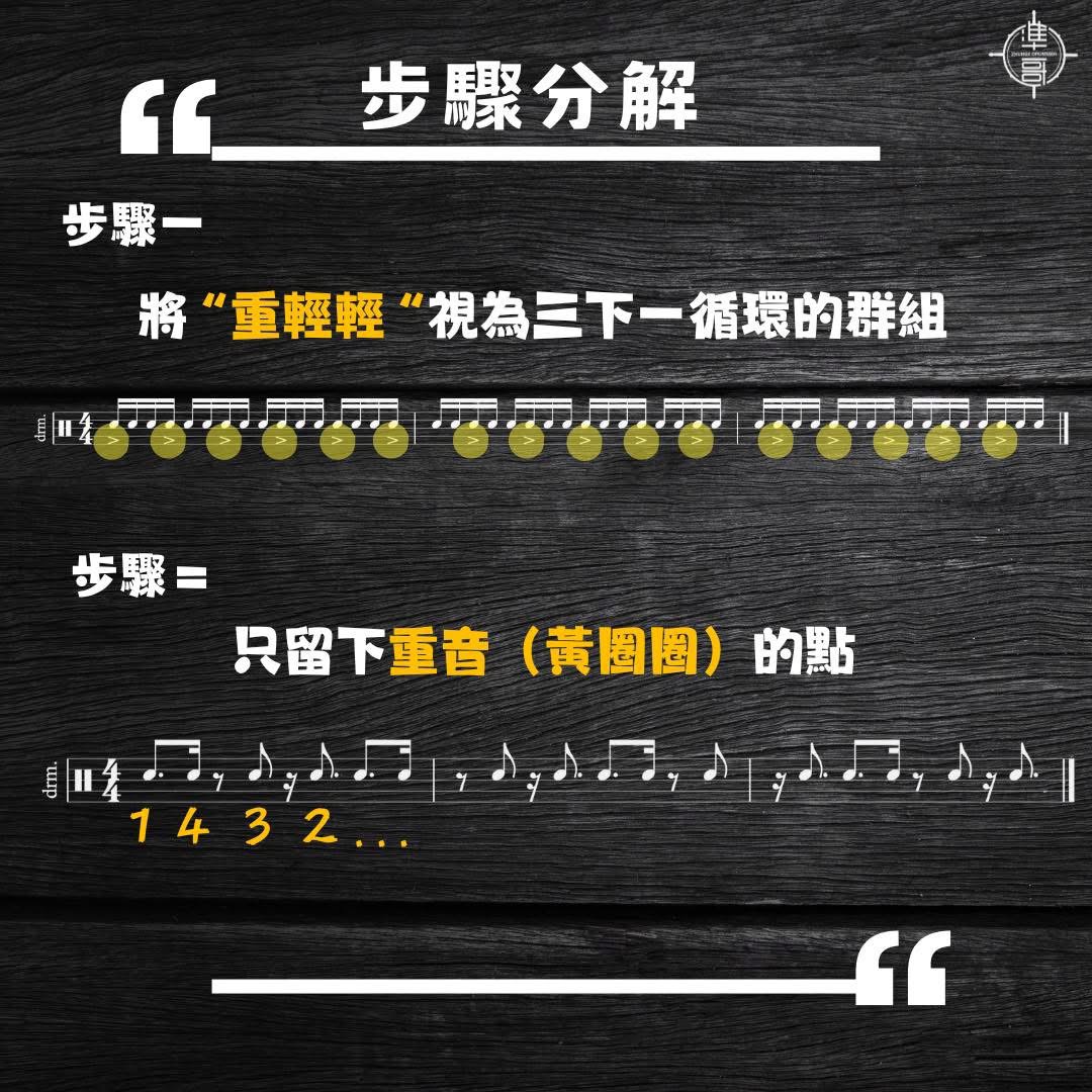 基本上鼓手在音樂三元素裡扮演節奏的角色,也就是音樂三元素的1/3,為了增加在演奏的豐富玩一陣子的朋友一定聽過群組(Grouping)練習,大部分開始都會從3循環最為入門,為了讓剛接觸的朋友練習更有感還提供兩個歌曲實例參考。